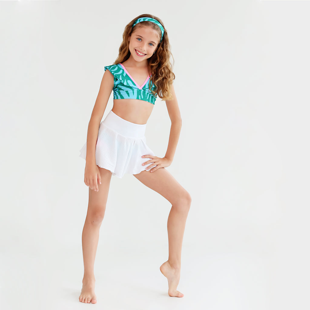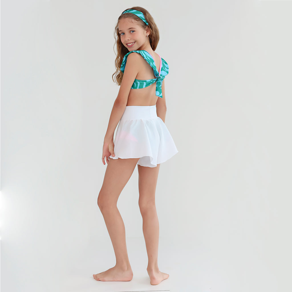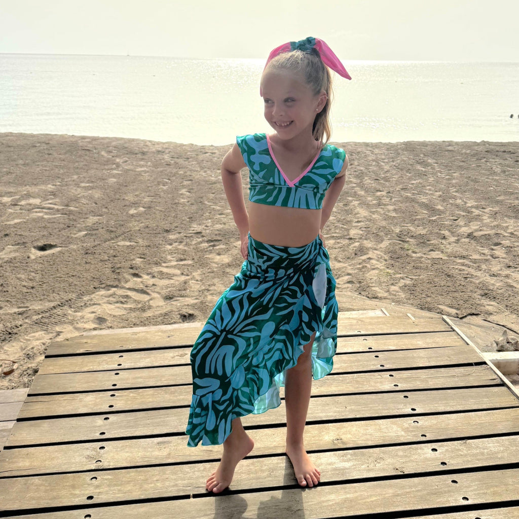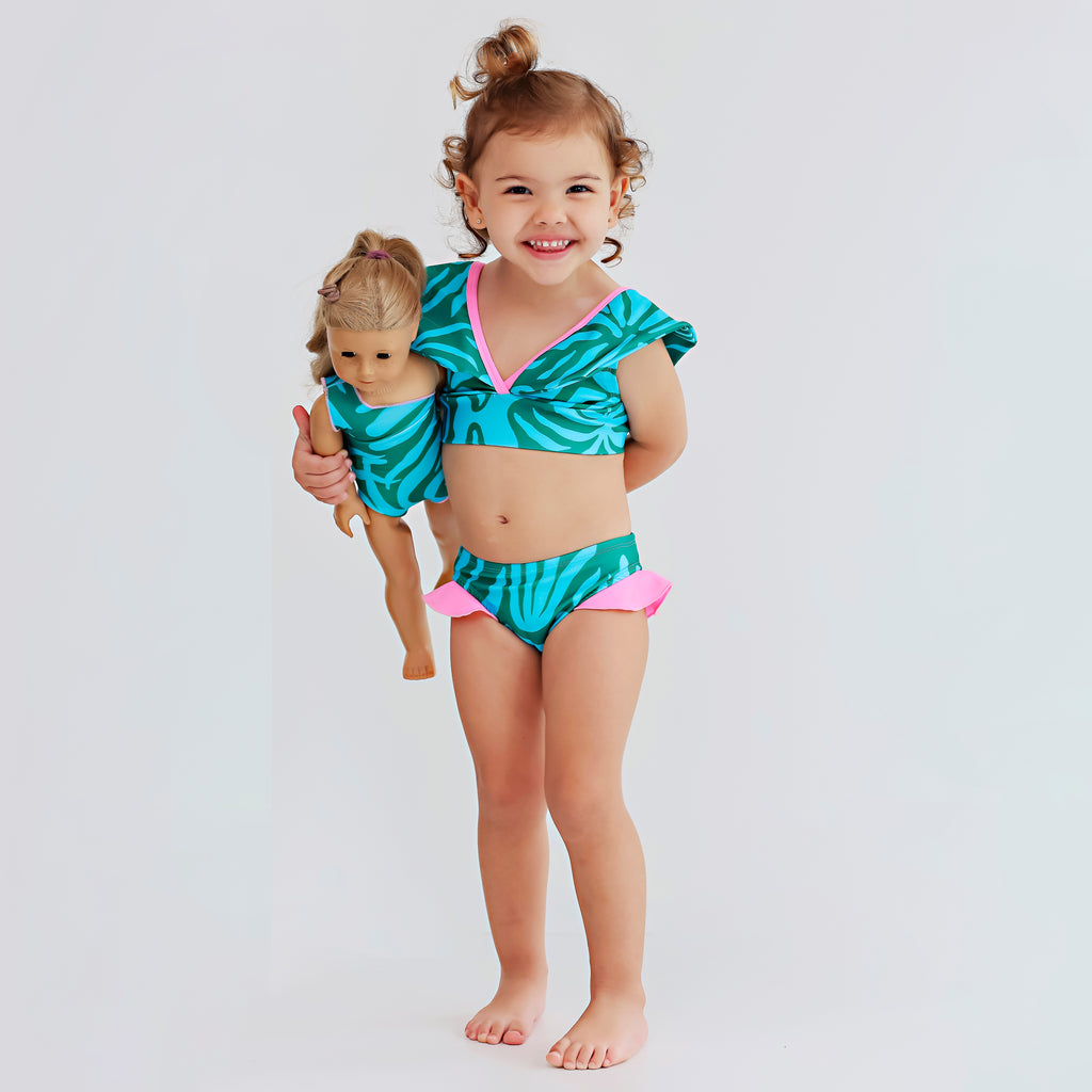 - Fun and chic blue and green print bikini with ruffles and pink details.
