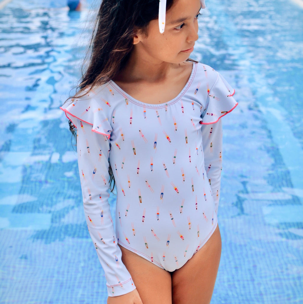 - Elegant long sleeve one piece swimsuit with delicate ruffles.